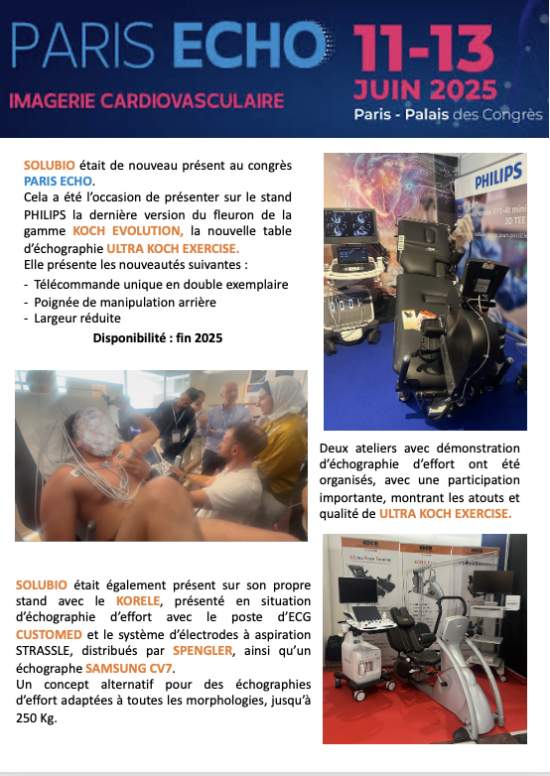 PARIS du 14 au 16 janvier 2026, au Palais des Congrès, SOLUBIO présentera la version 2026 de son divan d’échographie polyvalent ULTRA KOCH EXERCISE sur les stands SAMSUNG et SPENGLER, avec démonstration d’échographie d’effort sur ce dernier… Continue reading